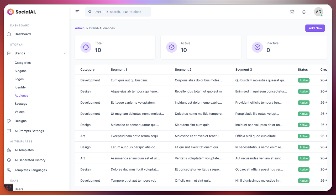 Admin PanelSocialAI CoreBrandsAudienceIdentity Go to https://yourdomain.com/admin/brand-audiencesOr click to Brands > Audience Note: Static Identity has used if mock data option has enabled.IdentityStrategy
